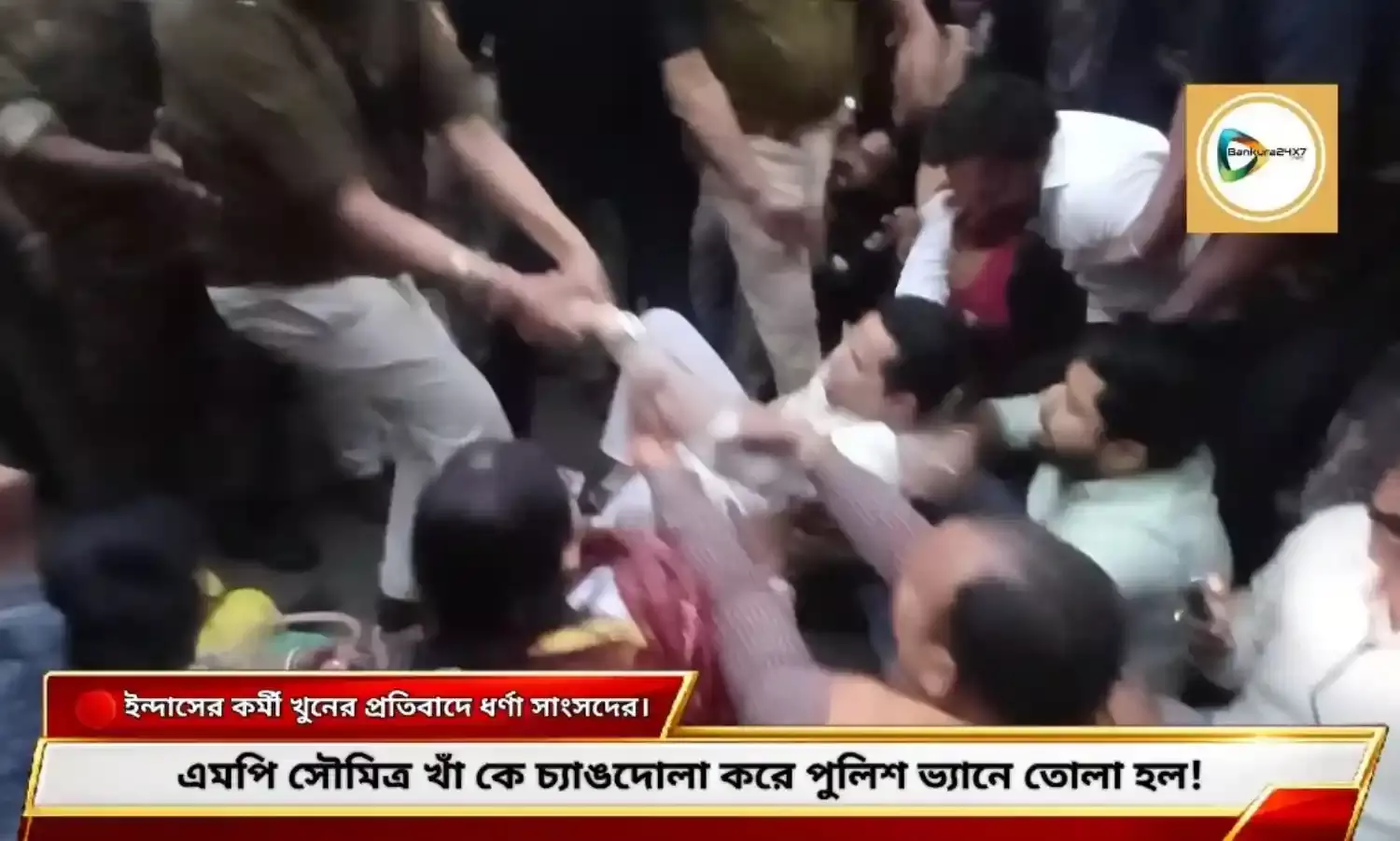 বাঁকুড়া২৪x৭ প্রতিবেদন : সাংসদ সৌমিত্র খাঁকে চ্যাঙদোলা করে পুলিশ ভ্যানে তোলার ঘটনায় রাজ্য রাজনীতি তোলপাড়! ইন্দাসে সুজয় রং(৪৬) নামে এক ব্যক্তি খুন হন। মৃতকে বিজেপি কর্মী বলে দাবি করে,এই খুনের প্রতিবাদে দোষীদের শাস্তির দাবী তুলে বাঁকুড়া শহরের চাঁদমারীডাঙ্গায় বাঁকুড়া এসপি অফিসের সামনে ধর্ণায় বসেছিলেন সাংসদ সৌমিত্র খাঁ।অবশেষে অবৈধ জমায়েতের অভিযোগ তুলে, পুলিশ সাংসদ সৌমিত্র খাঁ ও অন্যন্য বিজেপি কার্যকর্তা,কর্মীদের পুলিশ ভ্যানে তুলে বাঁকুড়া সদর থানায় নিয়ে যায় পুলিশ। পুলিশ ভ্যান থেকেই সৌমিত্র খাঁ বলেন, রাজ্যে আইনের শাসন শিকেই উঠেছে,পুলিশ দলদাসে পরিনত হয়েছে। রাজ্যে ৩৫৫ ধারা লাগু করার দাবিও তোলেন তিনি। পুলিশ বাঁকুড়া সদর থানায় সাংসদ সহ সকল কার্যকর্তা ও কর্মীদের আটকে রাখে।