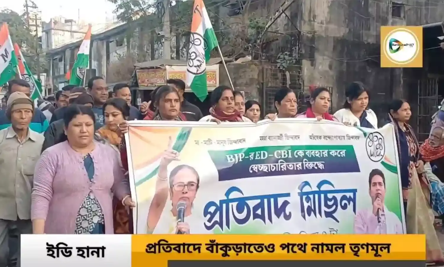 বাঁকুড়া২৪x৭প্রতিবেদন : আইপ্যাকের ডেরায় ইডির হানার প্রতিবাদে রাজ্যজুড়ে তীব্র ক্ষোভ তৃণমূল কংগ্রেসের। তারই প্রতিবাদে বাঁকুড়াতেও পথে নামলেন তৃণমূল নেতা-কর্মীরা। কেন্দ্রীয় সংস্থার অপব্যবহারের অভিযোগ তুলে স্লোগানে মুখরিত হয় শহরের রাজপথ। দেখুন প্রতিবাদের সম্পূর্ণ ভিডিও।