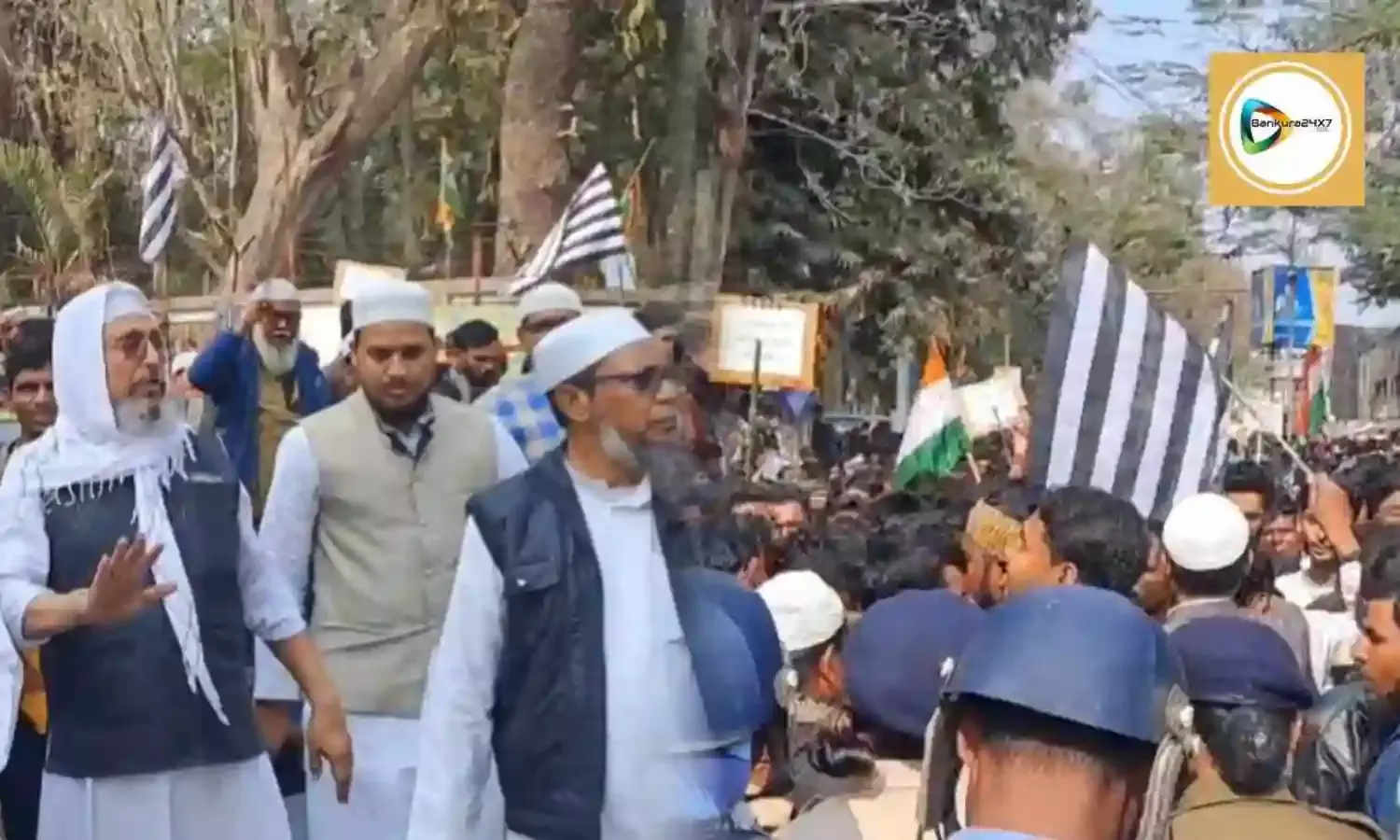 বাঁকুড়া২৪x৭প্রতিবেদন : এসআইআর এর শুনানিতে অযথা সংখ্যালঘু সম্প্রদায়ের মানুষজন হয়রানির শিকার হচ্ছেন?এই অভিযোগ তুলে, আজ বাঁকুড়া জেলাশাসকের অফিসে বিক্ষোভ প্রদর্শন ও ডেপুটেশন কর্মসুচির ডাক দেয় জমিয়তে উলামা-ই-হিন্দ এর বাঁকুড়া জেলা শাখা। প্রচুর সংখ্যালঘু সম্প্রদায়ের মানুষ এদিন প্রতিবাদ মিছিলে হাঁটেন। তামলীবাঁধ থেকে মিছিল করে তারা জেলাশাসকের অফিসে জমায়েত হয়ে বিক্ষোভ প্রদর্শন করেন। এই বিক্ষোভ কর্মসুচির জেরে উত্তাল হয়ে ওঠে পুরো কালেক্টরেট চত্ত্বর।মোতায়েন করা হয় প্রচুর পুলিশ৷ জমিয়তে উলামা-ই-হিন্দ-এর পক্ষ থেকে অভিযোগ তোলা হয়,নির্বাচন কমিশন তাদের এসআইআরে শুনানির নামে অযথা হয়রান করছেন! যাবতীয় নথি দাখিল করা স্বত্বেও, নাম তালিকা থেকে বাদ যাচ্ছে। ফলে বাধ্য হয়ে আন্দোলনে নামলেন অনেকেই।