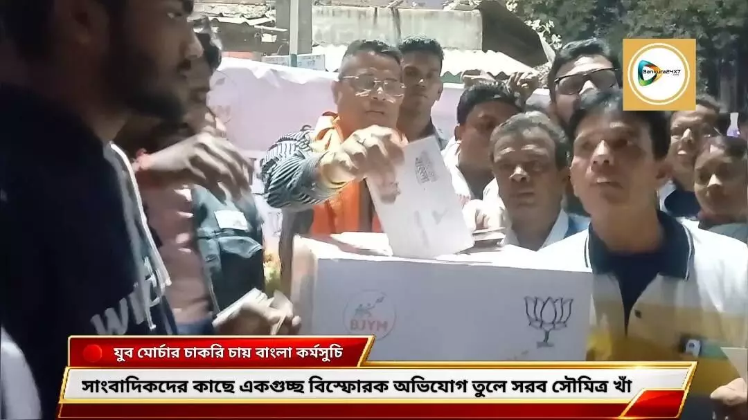বাঁকুড়া২৪x৭প্রতিবেদন : বাঁকুড়া শহরের জুনবেদিয়া মোড়ে যুব মোর্চার ‘চাকরি চায় বাংলা’ কর্মসূচিতে যোগ দিতে এসে একগুচ্ছ বিস্ফোরক অভিযোগ তুলে সরব হলেন সাংসদ সৌমিত্র খাঁ। বাঁকুড়া শহর লাগোয়া জুনবেদিয়া গ্রামীণ মোড়ে বিজেপির যুব মোর্চার উদ্যোগে অনুষ্ঠিত হয় ‘চাকরি চায় বাংলা’ কর্মসূচি। কর্মসূচিতে উপস্থিত ছিলেন বিষ্ণুপুরের বিজেপি সাংসদ সৌমিত্র খাঁ। সাংবাদিক বৈঠকে তিনি,এদিন একাধিক বিস্ফোরক অভিযোগ তুলে সরব হন।বিস্তারিত জানতে দেখুন আমাদের ভিডিও প্রতিবেদন।
