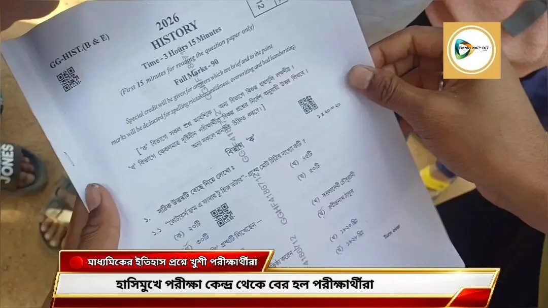 বাঁকুড়া২৪x৭প্রতিবেদন : ইতিহাসে হাসির ছোঁয়া! মাধ্যমিক পরীক্ষার্থীদের মুখে স্বস্তির হাসি সারা বাঁকুড়া জেলা জুড়ে।মাধ্যমিকের ইতিহাস পরীক্ষার প্রশ্নপত্রে খুশি পরীক্ষার্থীরা। প্রশ্ন তুলনামূলক সহজ হওয়ায় সবারই আশা—ভালো নাম্বার উঠবে। পরীক্ষা শেষে হাসিমুখে কেন্দ্র থেকে বের হতে দেখা গেল পড়ুয়াদের। বাঁকুড়া জেলা জুড়ে তৈরি স্বস্তি আর আনন্দের আবহ পরীক্ষার্থী মহলে। কেউ বলছে “সব পড়া থেকেই এসেছে”,কেউ বলছে “সময়ও ঠিকঠাক মিলেছে”,কেও বলছে" বিগত বছরের প্রশ্ন অনেক কমন এসেছে"।আবার কারও মুখে শুধুই আত্মবিশ্বাসের হাসি।তুমি বা তোমরাও কি এবছর মাধ্যমিকের ইতিহাস পরীক্ষা দিলে? কেমন হলো আজকের পেপার? কমেন্টে জানাও।